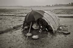 14) Саджал Чандра Дас ждёт когда прекратится дождь. Меньше чем за час дождь почти устроил наводнение. Все вещи намокли даже под навесом. Несмотря на это, пастухам всё равно придётся ночевать в поле.
