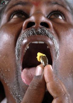 31. Мужчина глотает живую рыбу, Хайдарабад, 8 июня 2008 года. (REUTERS/Krishnendu Halder)