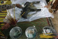 25. Жители деревни поливают водой тело мертвого теленка, которого посчитали священным из-за того, что он родился с кожей крокодила, 20 августа 2009 года. Люди считают, что, выпив эту воду, они смогут излечиться от ревматизма и других недугов. Камбодже, где люди живут на 1$ в день, не многие могут позволить себе обращаться к врачам, поэтому большинство из них верят в сверхъестественные целительные способности живых существ. (REUTERS/Chor Sokunthea)