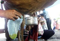 27. Жители Камбоджи собирают мочу коровы, которая, по их мнению, обладает исцеляющими способностями, 26 сентября 2002 год. (REUTERS/Chor Sokunthea)