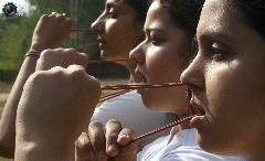 34. Школьницы выполняют одну из древнейших техник йоги "Rubber Neti", 21 мая 2009 года. Большинство индийцев считают, что благодаря этой технике можно излечиться от насморка, кашля, астмы и очистить носовые каналы. (REUTERS/Ajay Verma)