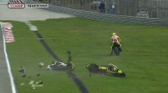 16. Стоп-кадр из видео, предоставленного Dorna Sports S.L., показывает, как упавший Марко Симончелли пересекает траекторию движения Колина Эдвардса (в центре) и Валентино Росси (слева) на повороте 11 во время гран-при на трассе Сепанг, 23 октября 2011 года. (AP Photo/Dorna Sports S.L.)