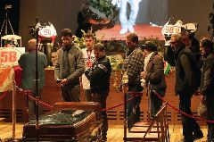 7. Пауло Симончелли и президент Олимпийского комитета Италии Джованни Петруччи (справа) у гроба погибшего мотоциклиста Марко Симончелли, прибывшего в аэропорт рима 25 октября 2011 года. Марко Симончелли погиб от тяжелых травм головы, шеи и грудной клетки после того, как потерял управление, и его мотоцикл оказался прямо на пути американца Колина Эдварда и итальянца Валентино Росси. (AP Photo/Angelo Carconi)