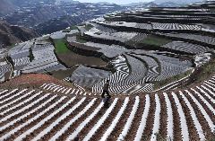 10. Фермер проходит мимо террасы с codonopsis pilosula, известного лекарственного растения, которое в Китае называют "дань шен", 31 мая 2011 года. Пластиковые крышки защищают корни растения и обеспечивают им необходимую температуру и влажность. Растение, использующееся в качестве заменителя женьшеня, способствует снижению кровяного давления и усилению иммунной системы. (Reuters/Stringer)
