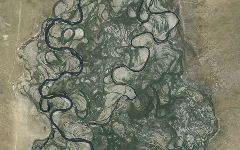 28. Одинокая юрта (белая точка в левом верхнем углу) у грунтовой дороги недалеко от реки Туул в Монголии. Снимок Google Earth. Русло реки в этом месте имеет ширину около трех километров. (© Google, Geocentre Consulting, Mapabc.com, Ches/Spot Image)