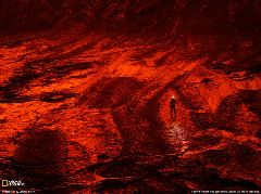 24. Вулкан Ньирагонго, Конго. Участник экспедиции на остывшей лаве, окрасившейся в красный цвет под отражением в сиянии озера, в вулкане Ньирагонго в Демократической республике Конго. «Здесь внизу вы чувствуете вулкан, – говорит фотограф Карстен Петер. – Вы чувствуете рокот на низких частотах, пульсирующий в вашем теле, вы как будто внутри огромного сабвуфера». (Carsten Peter)