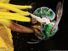 26. Галикт в Аризоне. Галикт энергично опыляет ядовитый цветок пален. Во время трясущихся движений золотистая пыльца слетает с тела насекомого, в результате чего происходит опыление цветка. (Mark W. Moffett)
