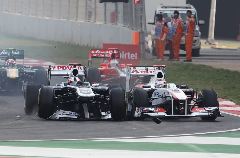36. В хвосте пелотона произошёл инцидент с участием Баррикелло, Кобаяши и Глока.