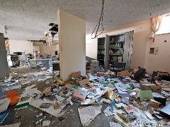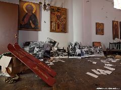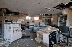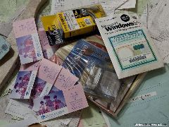 13. На первом этаже размещались административные помещения с “потёкшими” ныне стойками аудиотрансляций, компьютерными серверами и ящиками разнообразных бумажек, в частности лицензионным софтом фирмы Микрософт. Диски и серийные сетификаты – всё на месте.