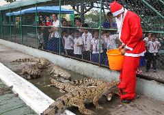 25. Брюки этого Санта Клауса безнадежно испорчены крокодилом с крокодиловой фермы в Маниле. Филиппины, 16 декабря 2011 года. Согласно римо-католической традиции, здесь начинают играть рождественские мелодии в супермаркетах еще в сентябре. (Reuters/Romeo Ranoco)