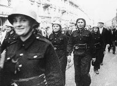 24. Польские женщины в стальных шлемах и военной форме идут маршем по улицам Варшавы, готовые встать на защиту столицы после вторжения немецких войск в Польшу, 16 сентября 1939 года. (AP Photo)