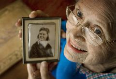 45. Сьюзи Бэйн позирует фотографу со своим портретом 1943 года в Остине, штат Техас, 19 июня 2009 года. Во времена Второй мировой войны Бэйн служила в Женской службе пилотов Военно-воздушных сил США. 10 марта 2010 года более 200 ныне живущих военнослужащих Женской службы пилотов Военно-воздушных сил США были награждены Золотой медалью Конгресса США. (AP Photo/Austin American Statesman, Ralph Barrera)