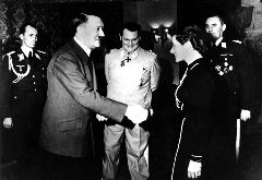9. Летчица-испытатель капитан Ханна Райтш пожимает руку канцлеру Германии Адольфу Гитлеру после получения награды «Железный крест» II степени в берлинской рейхсканцелярии. Летчица получила эту награду за заслуги в развитии военной авиации. На заднем плане в центре стоит рейхсмаршал Герман Геринг, а на заднем плане справа – генерал-лейтенант Карл Боденшатц. (AP Photo)