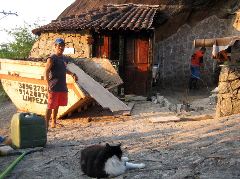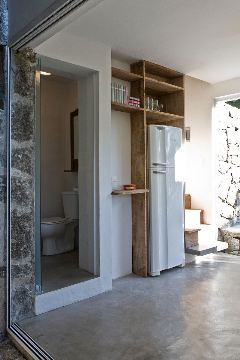 У нового дома два этажа, и второй – белая бетонная коробка, как бы поставленная сверху на каменные стены. Здесь располагается спальня и отсюда открывается вид на материк и пролив. На первом этаже находится гостиная, кухня и ванная. Некоторые двери, лестница и полки изготовлены из деревянных частей строительных лесов и опалубки бетонного ящика. Этот ящик размерами 3 на 5 метров с одной стороны поддерживается каменной стеной первого этажа, а с другой – подпорной стенкой.