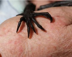 7. Летучая мышь схватилась лапкой за плечо смотрительницы. Коготки покрасили ,чтобы смотрители могли отличать сирот и правильно их кормить и лечить. (Eric Bowden)