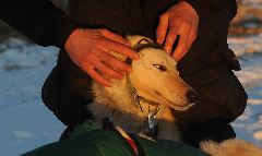 18. Погонщица Эллен Халверсон втирает прописанное ветеринарами розовое масло в лапы одной из собак в контрольном пункте Такотна 10 марта. (AP Photo/BOB HALLINEN / Anchorage Daily News)