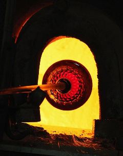 4. Чтобы придать стеклу форму, стеклодув сначала достает расплавленное докрасна стекло из печи стеклодувной трубкой, которую предварительно накаливают, опустив в раскаленную стекломассу в печи. На снимке: стеклянную вазу кладут в печь. (Dan Kitwood, Getty Images)