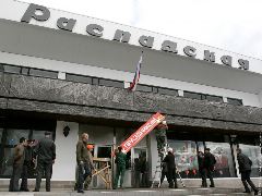 1) Рабочие снимают праздничную вывеску над входом на проходную шахты Распадская. (REUTERS/Александр Уракчин)