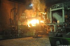 4. После окончания завалки в печь опускают электроды, включают высоковольтный выключатель и начинают период плавления. Температура в печи достигает 1650 градусов. Этого достаточно, чтобы расплавить все, что угодно. Коротко о конструкции печи. Ее рабочее пространство ограничено сверху куполообразным сводом, снизу сферическим подом и стенками с боков. Огнеупорная кладка пода и стен снаружи заключена в металлический кожух. Соответственно, внутрь печи опускаются электроды. Плавка – это самый драматичный этап производства стали. Пожалуй то, что происходит в момент плавки в печи – и есть ад. Весь процесс сопровождает невообразимый грохот, биение искр и пламени. Очень захватывающе! Поскольку в металлоломе может быть все, что угодно, включая взрывоопасные вещества, за процессом лучше наблюдать как можно дальше от печи. Поближе к бетонным колоннам, которые, в случае чего, могут уберечь человека от взрыва.