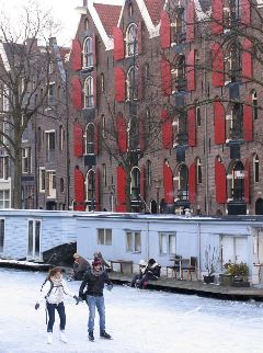 В столице Нидерландов несколько из известных городских каналов замерзли, дав жителям возможность вдоволь покататься на коньках.