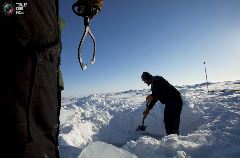 5. Сотрудники станции закрепляют гидролокационное оборудование. Ник Мичел-Харт (на фото второй слева) держит в руках ледовый бур, а лейтенанты Брендон Шмидт (справа) и Джордж ССѓ обрабатывают уже сделанные во льду отверстия. Новая, улучшенная система гидроакустики помогает подводной лодке "Нью-Хэмпшир" быстро найти относительно свободный ото льда участок воды для экстренного всплытия. У одного из ее матросов случился приступ аппендицита, и его нужно срочно эвакуировать. Система связи "Deep Siren", разработанная компанией Raytheon, призвана решить задачу обеспечения надежной связи с подводными лодками, находящимися на больших глубинах и большом удалении.