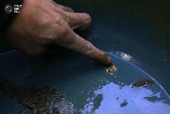 15. Для своей работы "черные копатели" постоянно носят у себя за спиной металлические зеленые тазы. Из-за вида их называют - "ниндзя", так как они становятся похожими на героев популярного мультфильма про черепашек-ниндзя. На фото: Шахтер показывает крупицы золота, которые лежат на дне миски, на небольшом холме с видом на пастбища к юго-востоку от Улан-Батора. (DAVID GRAY/REUTERS)