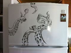Чарли Лэйтон - дизайнер-фрилансер и иллюстратор из Филадельфии, США. Каждую неделю он рисует на своем холодильнике легко стираемым маркером. Свои творения Чарли каждую неделю выкладывает в Фейсбуке под общим названием "Морозные пятницы". На создание каждого из этих "маркерных шедевров" у Чарли уходит около 20-30 минут, и обычно он завершает их за чашкой утреннего пятничного кофе. Вот так, дорогие, магнитики на холодильник уже не в моде. Рисунки маркером - вот тренд сезона!