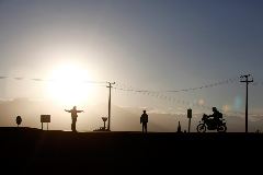 28. Робби Гордон и штурман Келлон Уолч (на крыше) из Соединенных Штатов отдыхают в своем Хаммере перед началом шестого этапа ралли, 10 января. (Виктор Кайвано/Associated Press)