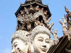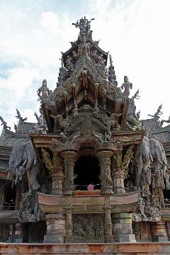 Храм Истины - это храм в Паттайе, Таиланд, который представляет собой здание из дерева с огромным количеством скульптур на основе буддистской и индуистской мифологии. Высота строения - около 105 метров. Храм выполнен в архитектурном стиле "визионерское искусство", в котором узоры основываются на традиционных религиозных темах. Весь этот строительный проект начался как идея тайского бизнесмена Лека Вирияфанта в 1981 году. Храм еще не закончен, окончание его строительства назначено на 2025 год.