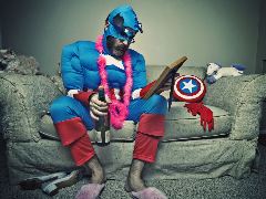 проекте Пола Армстронга под названием "Быт стареющего супергероя" перед нами предстает совершенно иная - негламурная - сторона жизни супергероя, точнее, Капитана Америка. Проект начался в 2008 году и продолжался до 2010 года. На этих снимках супергерой не борется с преступностью или несправедливостью. Он просто пытается "удержаться на плаву". Далее - комментарии фотографа.
