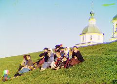 27. Русские дети сидят на холме недалеко от церкви у Белого озера в 1909 году. (Prokudin-Gorskii Collection/LOC)