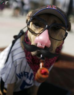 11. Собака по кличке Кофе в костюме бейсбольного фаната у стадиона "Citi Field" перед матчем "New York Mets" против "Florida Marlins" в Ньью-Йорке 5 апреля 2010 года. (REUTERS/Mike Segar)