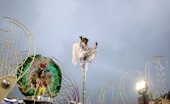 8. Ученики школы самбы Унидос до Перухе на движущейся декорации в первую ночь парадов на Самбадроме в Сан-Паулу. Знаменитый бразильский карнавал стартовал вечером 4 марта: миллионы людей с танцами и песнями вышли на улицы северо-восточного города Сальвадор де Бахиа, дав начало карнавальным празднествам, которые продлятся целую неделю. . (Mauricio Lima/AFP/Getty Images)