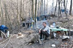 Погружаясь все глубже в лес, я услышал лай собаки - это значило, что я иду в верном направлении. До убежища бомжа мне предстояло пройти ещё 100 метров. Бомжа зовут Павел Симонов. На мое появление он отреагировал довольно спокойно, лишь поинтересовался кто я и зачем я здесь. На вопросы отвечал неохотно, а исследованию его участка никак не препятствовал.