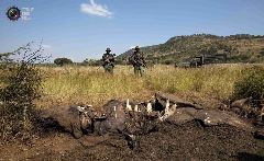 12. На этом недатированном снимке, предоставленном вооруженными силами Демократической Республики Конго, туши 22 слонов, убитых браконьерами с вертолета, лежат на земле в национальном парке Гарамба, Конго. (REUTERS/DRC Military/Handout)