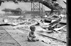 18. Плачущий китайский ребенок на платформе разбомбленной железнодорожной станции "Юг" в Шанхае.