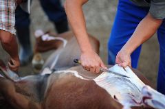 18. Бейсенбы начинает первым. Вначале он снимает шкуру, начиная с конечностей и живота лошади.