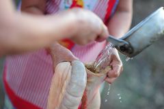 34. Пока Резхан хозяйничает на кухне, во дворе другие женщины очищают кишки и карта. Аписан разрезает ножом кишку, а Кулеймаш помогает ей, придерживая за другой конец. Обе они соседки хозяина фермы.