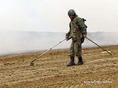 38. Впереди пойдут два сапера с щупами на таком расстоянии друг между другом, которое позволит затем проехать бронетехнике. За саперами тянутся полосы, отмечающие участок для безопасного проезда.