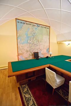 17. Зал заседаний правительства. После тоннельной сжатости площадок и казематной тесноты полукруглых рабочих комнат попадаем в довольно просторное помещение с огромным Т-образным столом; вдоль него - длинный стол для стенографисток, которые должны были сидеть спиной к выступавшим, чтобы не видеть их лиц. углу при входе - столики для охраны и личного секретаря вождя Поскребышева. За сталинским креслом - огромная, во всю стену, карта фронтов конца 1941 года.