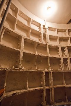 12. Пройдя гермодвери, мы попадаем в главную часть бункера - вертикальный ствол-убежище, уходящий в глубь земли еще на 23 метра. Он - точная копия метрополитеновского тоннеля, прорытого отвесно. Если пропустить спуск по шахтам, то и не скажешь, что находишься на глубине 8-этажного дома. Кажется, что ты просто в подъезде дома.