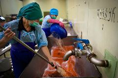 Да и сегодня здесь почти все так же. На рыбозаводах заняты в основном приезжие. Местные только технари, технологи да администрация. Остальным специальные знания без надобности, так как технологический цикл на заводе прост, как мычание. Рыбу нужно принять, взвесить, подать на разделочные столы, а затем разложить по баночкам, присыпав слегка солью и пряностями. Баночки потом - в автоклавы и на отгрузку. С икрой дела обстоят чуть мудреней. Ее сначала надо извлечь из рыбьих ястыков, засолить (5-7 минут) отжать в центрифуге, а затем уж упаковывать в пластмассовые емкости, если икра идет на развес.