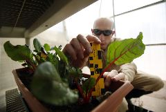 21. Ханс ван От Вуд ухаживает за растениями, выращенными в теплице на станции.