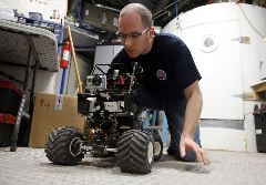 4. Инженер Мэтт Кросс работает с уменьшенной копией марсохода.