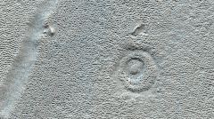 20. Образование в 4 км недалеко от края южного полярного радиального круга. Яркие участки на этом фото покрыты сухим инеем, а так называемая область "швейцарского сыра", типичная для этого региона, покрывает большую часть области. На темных стенках круглого образования не так много инея, а сами стенки образуют многосторонние узоры. Очевидно, поверхность стенок была сильно изменена тепловым расширением и сокращением ледниковых вод. Также, похоже, что область "швейцарского сыра" покрыла дно круглого образования, а также область вокруг образования, что затрудняет определить происхождение образования. (NASA/JPL/University of Arizona)