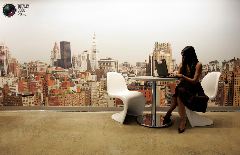 17. Сотрудница компании "Google" работает с ноутбуком перед изображением панорамы Нью-Йорка, в нью-йоркском офисе компании.