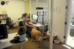 8. Сотрудник со своей собакой в своем кабинете 3 марта 2008 года. Снимок сделан в штаб-квартире компании. Первые четыре здания комплекса "Googleplex" были изначально построены для компании Silicon Graphics в 1997 году; в 2003 году Google взял их в аренду, а в 2006 выкупил вместе с другой собственностью Silicon Graphics (общая стоимость сделки составила 319 миллионов долларов).