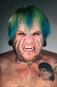 27 лет. Управляющий неформальным хостелом. Являюсь первым в России, кто сделал тату на белке глазного яблока. Тату на лице (в процессе), нарощены клыки, сплит языка, тату практически по всему телу, тоннели в ушах, пирсинг на лице, сосках, члене.