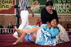 Рикардо Бонони, категория "Спорт", первое место. Фотограф побывал в бедном районе боливийской столицы, города Ла-Пас, и запечатлел публичные бои, которые каждое воскресенье проводят крестьянки. Боливии больше всего работающих женщин среди латиноамериканских стран. Эти женщины не только дерутся, но и работают в поле, чтобы затем продать урожай на рынках города. В© Riccardo Bononi / IRFOSS / Sony World Photography Awards