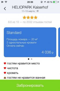 Есть некая "Вилла Гламур" за 5050 рублей, но вид у нее не очень гламурный, да и оценка всего 8,4 балла. Выберем лучше Heliopark Kaiserhof за 4036 рублей — выглядит солидно, оценка 8,6 из 10 по 2032 отзывам гостей. Список услуг в отеле впечатляет, он на два экрана — здесь и свадебный люкс, и консьерж, и сауна, и некие VIP-услуги. Но — тем же гостям не нравится ванная. Всем не угодишь. Что еще есть?